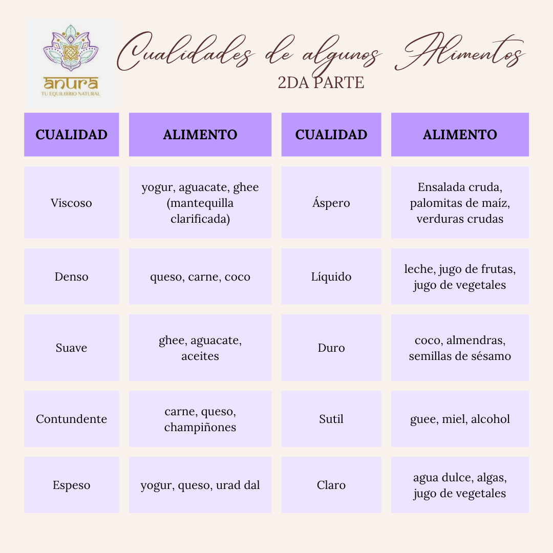 Al igual que los doshas, ​​cada tipo de alimento se compone de ciertas cualidades. Por ejemplo, las palomitas de maíz son livianas y secas, mientras que el queso es pesado y aceitoso.