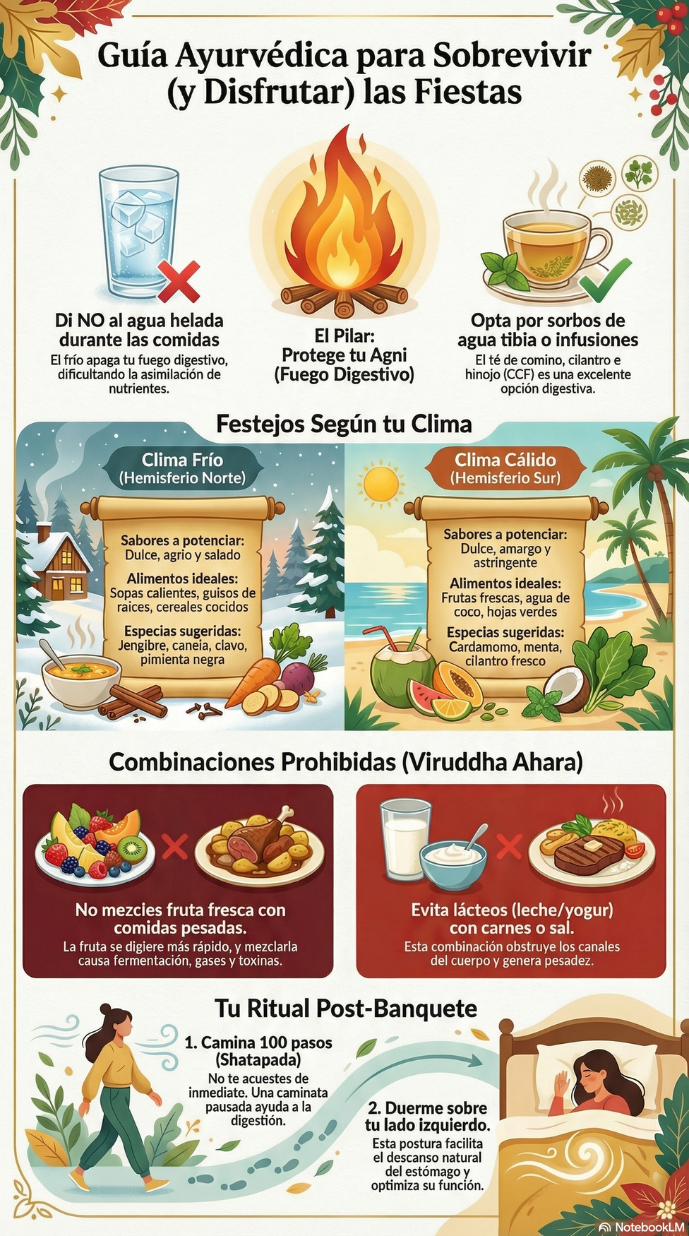 Recomendación universal: Durante los banquetes, evita el agua helada. El frío apaga el fuego digestivo, dificultando la transformación de los alimentos en energía. Opta por sorbos pequeños de agua tibia o infusiones digestivas como el té de comino, cilantro y el hinojo (CCF).